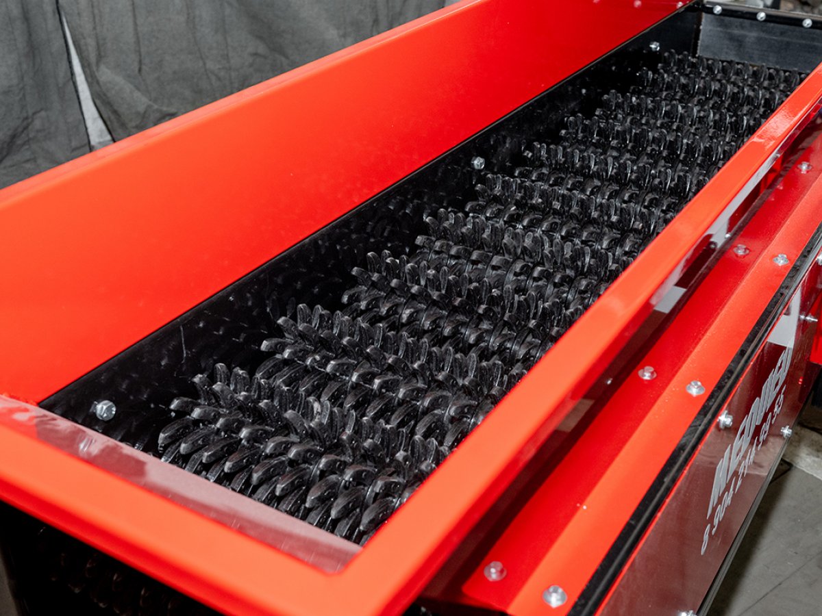 На конечной стороне стола, стоит вал с синтетической щеткой, для смягчения чеснока на выходе.